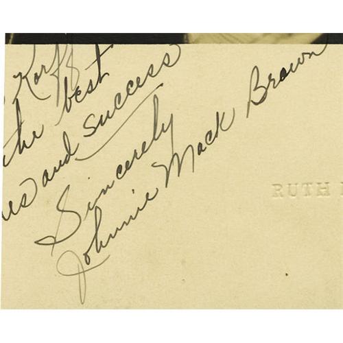 <B>Johnny Mack Brown Signed Photo.</B></I> A great b&w 11" x 14" photo of the the silent-era cowboy hero by early Hollywood glamour photographer Ruth Harriet Louise, inscribed and signed by Brown in black ink. The photo features Louise's studio stamp on the back, and her name is embossed on the lower right corner. In Very Fine to Excellent condition with light edge wear and light overall tanning. <I>Accompanied by LOA from PSA/DNA.</B></I><BR><BR><b>Shipping:</b> Small Flat (<a target="_blank" href="http://www.heritageauctions.com/common/shipping.php">view shipping information</a>) <BR><BR><B>Important notice:</