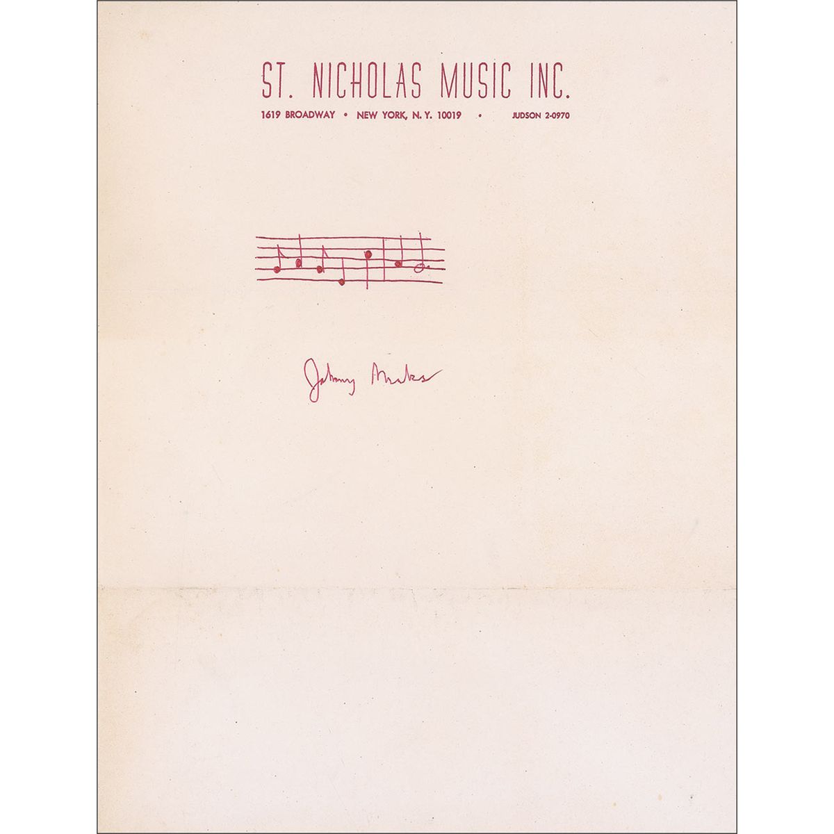 Crisply penned AMQS on an 8.5 x 11 sheet of St. Nicholas Music Inc. paper. Marks pens two neat bars of music from ‘Rudolph, the Red Nosed Reindeer,’ signed below, “Johnny Marks.” In fine condition, with light toning, and two horizontal folds.
