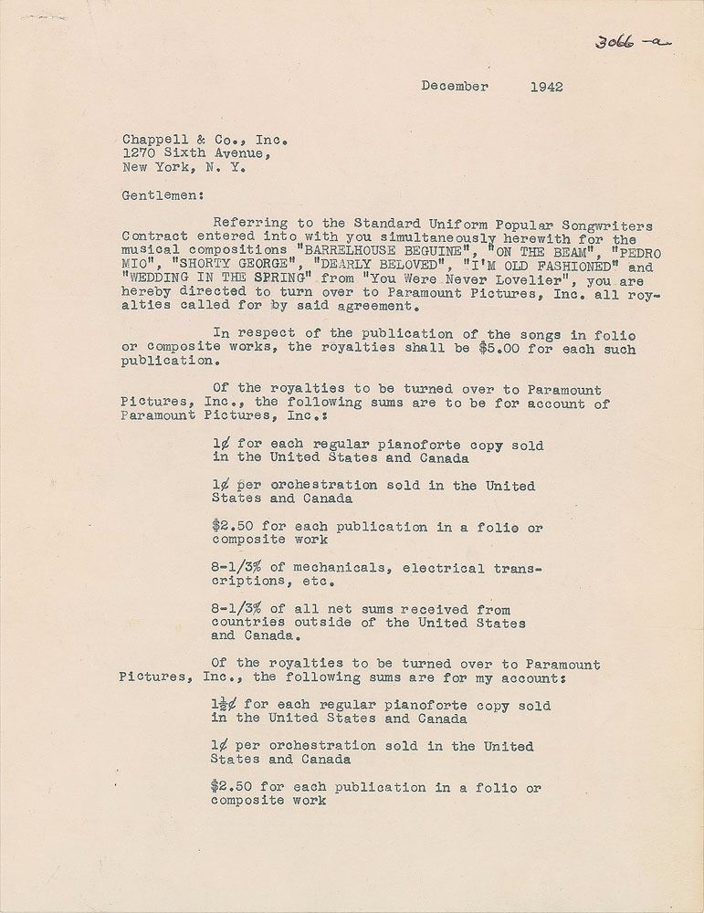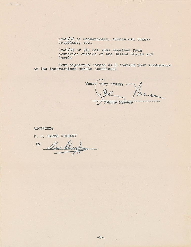 Academy Award-winning lyricist (1909–1976) who penned such classics as 'One for My Baby,' 'Days of Wine and Roses,' and 'Moon River.' DS, two pages, 8.5 x 11, December 1942. Agreement between Mercer and the T. B. Harms Company, in which the latter are to "turn over to Paramount Pictures, Inc. all royalties called for" from the 1942 film 'You Were Never Lovelier,' which includes the musical compositions 'Barrelhouse Beguine,' 'On the Beam,' 'Pedro Mio,' 'Shorty George,' 'Dearly Beloved,' 'I'm Old Fashioned,' and 'Wedding in the Spring.' Signed at the conclusion in fountain pen by Mercer. In fine condition.