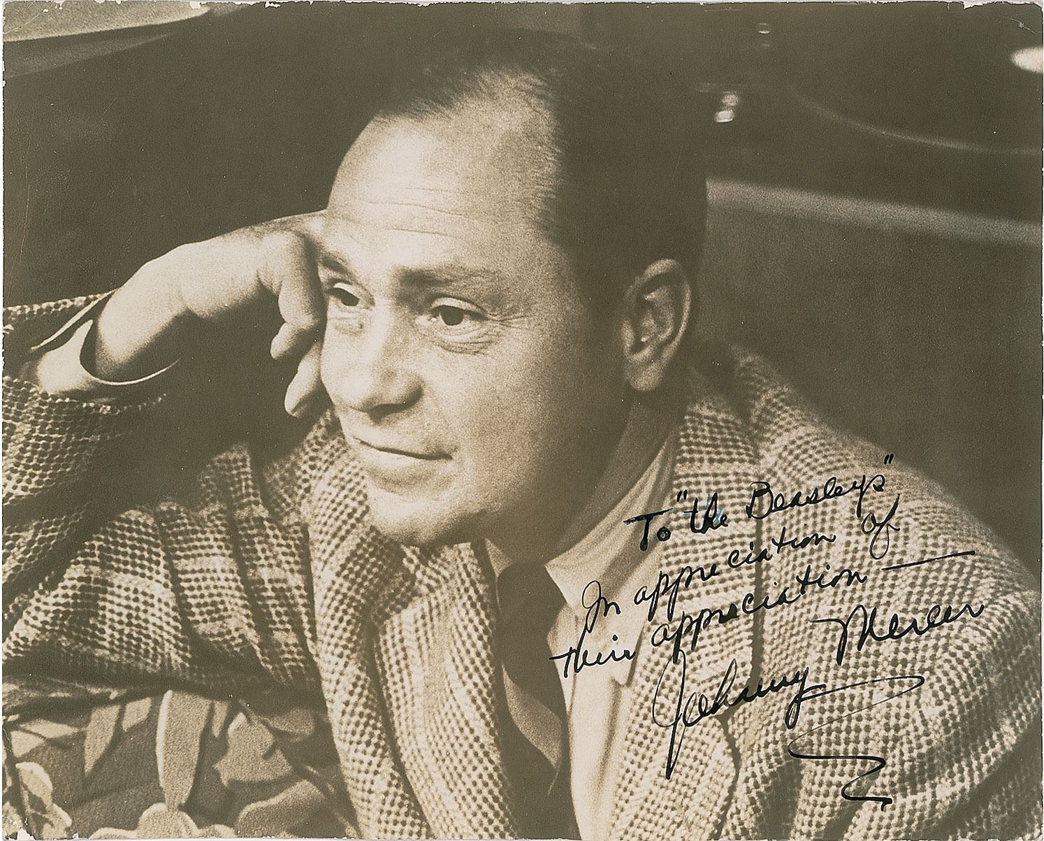 Academy Award-winning American lyricist (1909-1976) who penned such classics as 'One for My Baby,' 'Days of Wine and Roses,' and 'Moon River.' Vintage semi-glossy 10 x 8 photo of Mercer in a relaxed pose, signed and inscribed in bold black ink, "To 'the Beasleys,' in appreciation of their appreciation—Johnny Mercer.” In fine condition, with a few light creases.