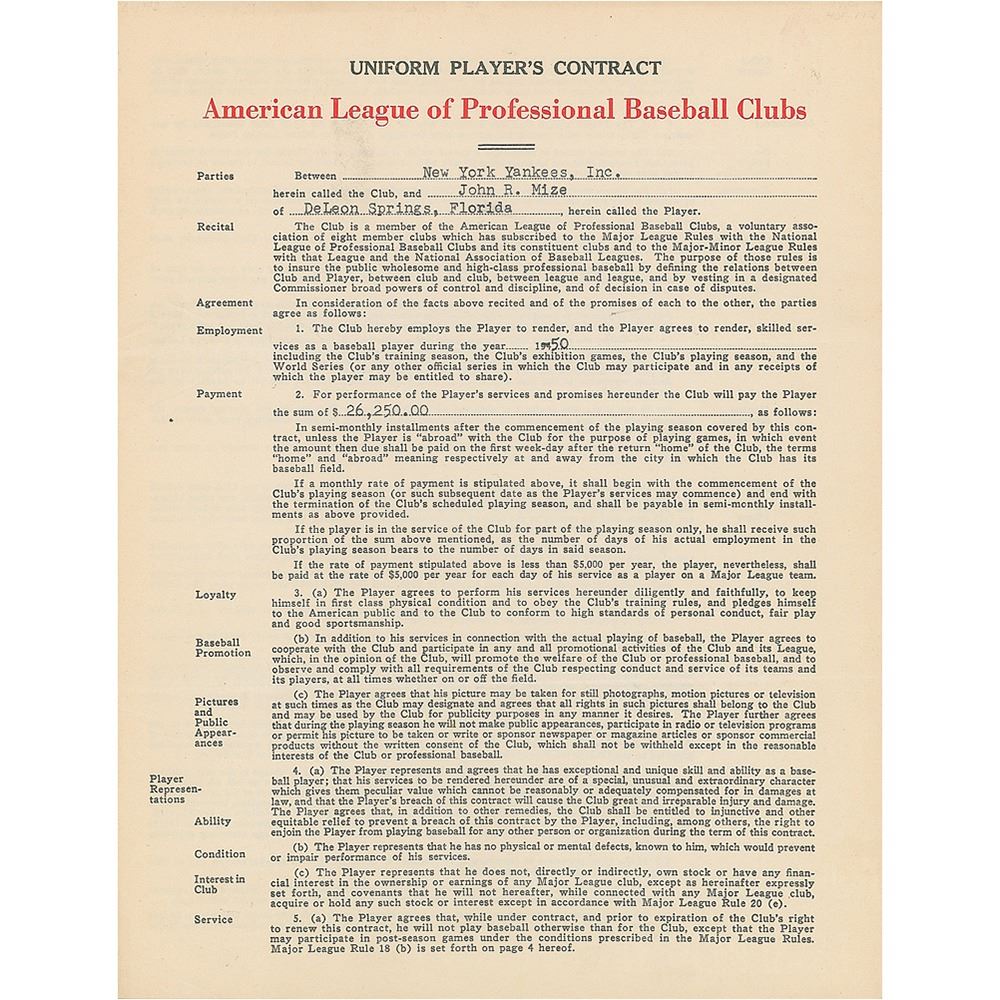 Contract, signed “John R. Mize,” four pages on two adjoining sheets, 8.5 x 11, January 26, 1950. American League uniform player's contract in which Johnny Mize agrees to render "skilled services as a baseball player during the year 1950" for the New York Yankees, for a salary of $26,250. Signed and dated at the conclusion in crisp fountain pen by Collins, who adds his address and social security number below. Countersigned by Yankees General Manager George Weiss and by American League President William Harridge. In fine condition. Accompanied by a full letter of authenticity from PSA/DNA.