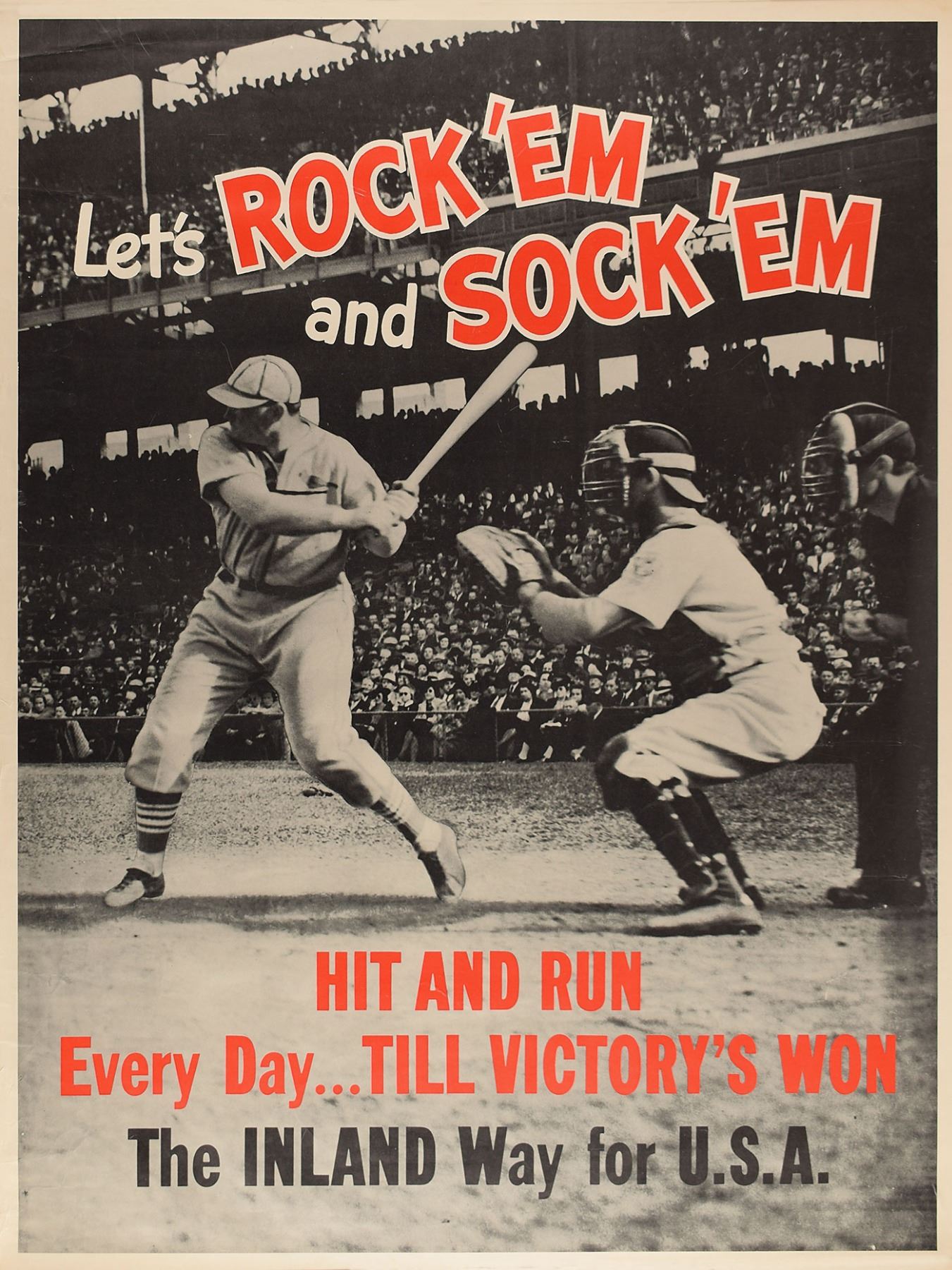 Original World War II–era color 31 x 41 propaganda poster featuring an image of Hall of Famer Johnny Mize at bat issued by the 'Inland' division of General Motors to encourage wartime production, with the large slogan at the top, "Let's Rock 'em and Sock 'em," and text below: "Hit and Run, Every Day…Till Victory's Won, The Inland Way for U.S.A." Rolled and in very good to fine condition, with light creasing, and some short tears and minor loss to the borders.