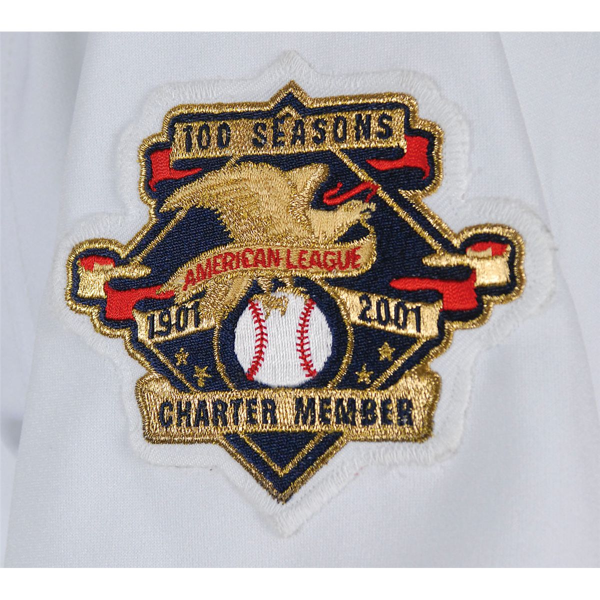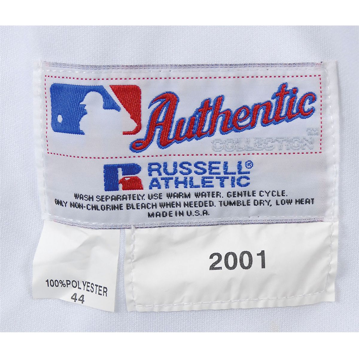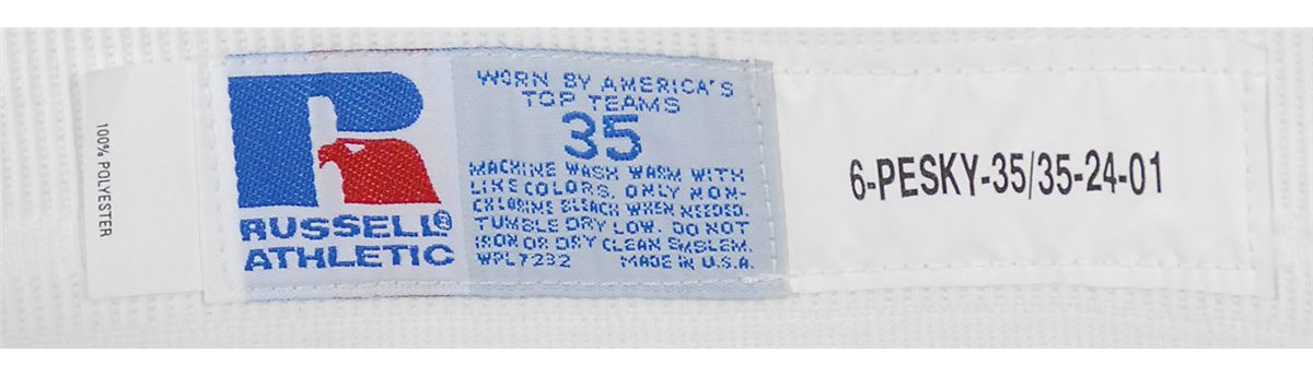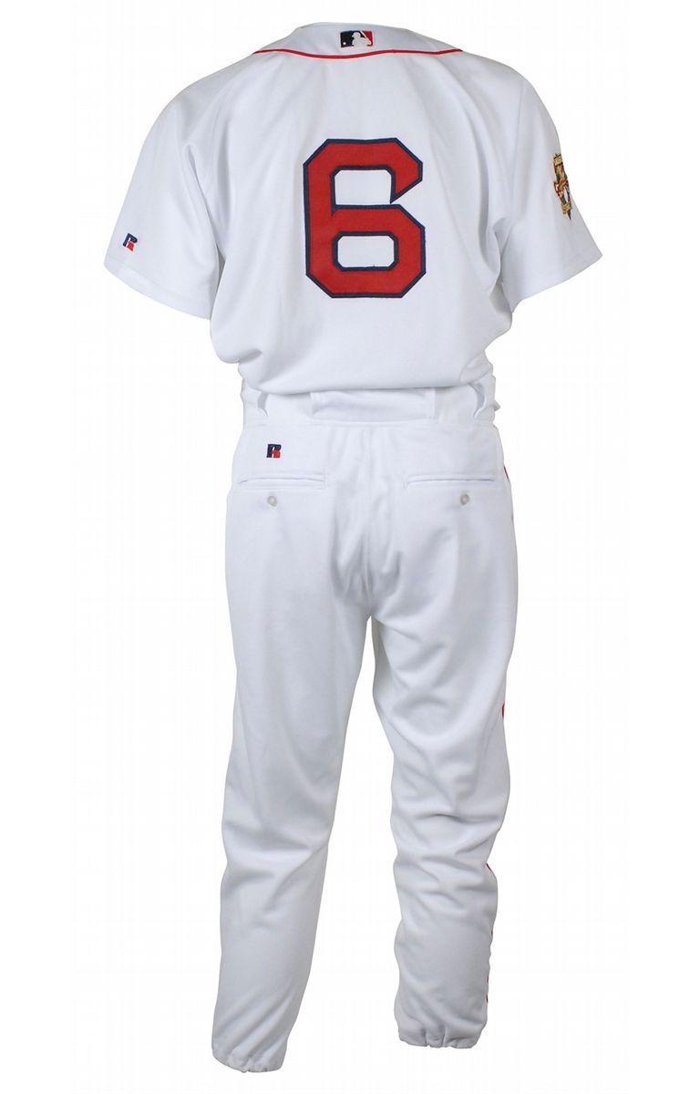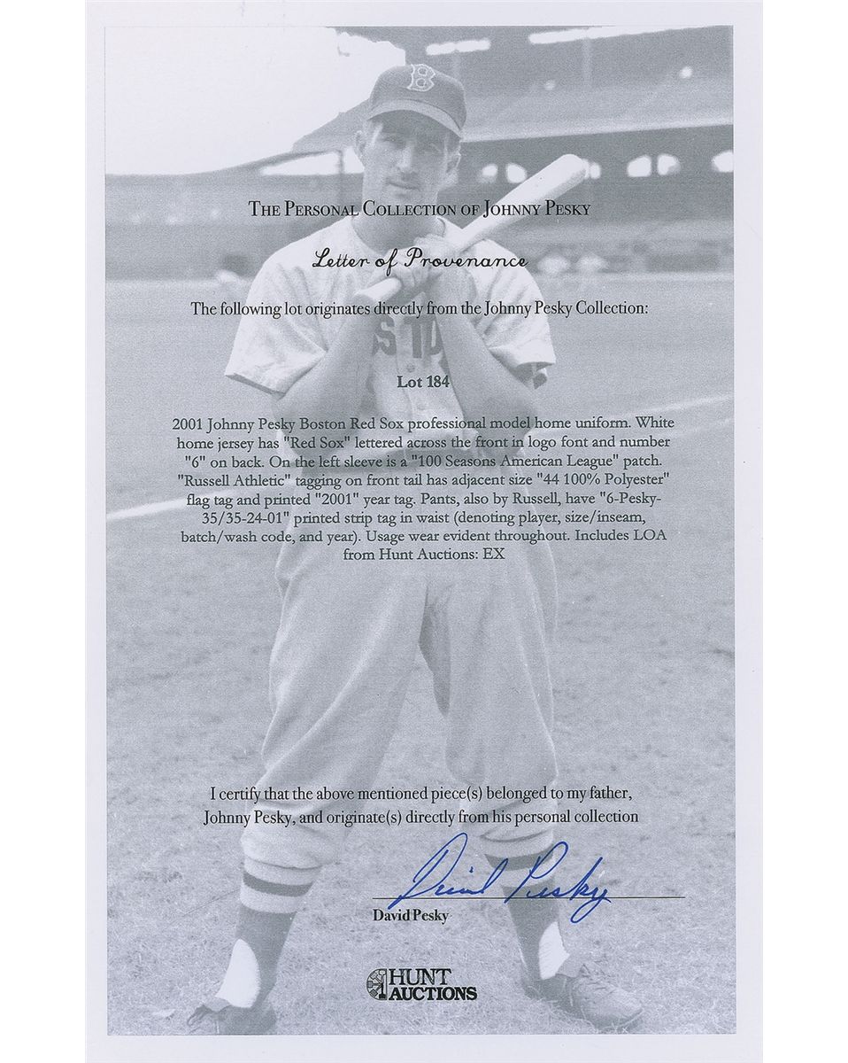 Pesky’s 2001 Russell Athletic Boston Red Sox home uniform consisting of both his jersey and pants. The jersey has “Red Sox” lettered across the front, his number “6” on the back, a 100th anniversary of the American League patch sewn on to one shoulder, and the Russell label sewn on to the front tail. Matching pants have, “6-Pesky-35/35-24-01,” printed on the tag on the waist. In fine condition. Accompanied by a letter of authenticity from Hunt Auctions’ sale of the Pesky Collection, as well as a letter of authenticity from Pesky’s son which states, “usage wear evident.”