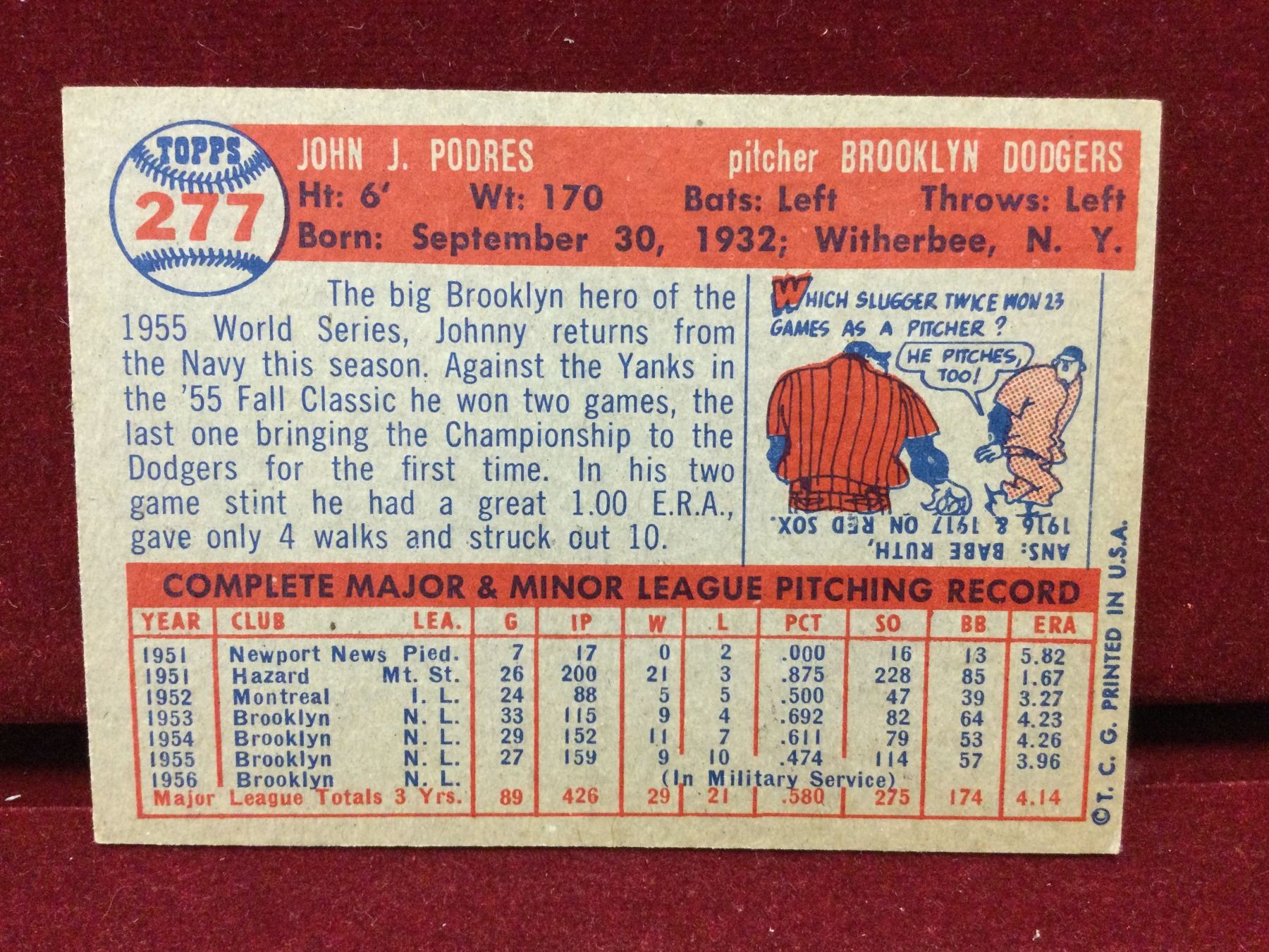 You are bidding on a Johnny Podros Topps Baseball Card #277