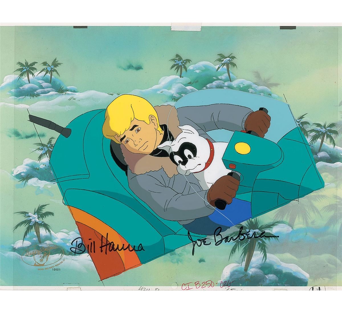 (Hanna-Barbera Studios, 1986) Original cel featuring Johnny Quest and Bandit from The New Adventures of Johnny Quest. The cel is placed on a matching studio copy background. Image of Johnny and Bandit in measures 12 x 7.5, with overall dimensions of 13.25 x 10.5. Signed in black felt tip by Bill Hanna and Joe Barbera. In fine condition.