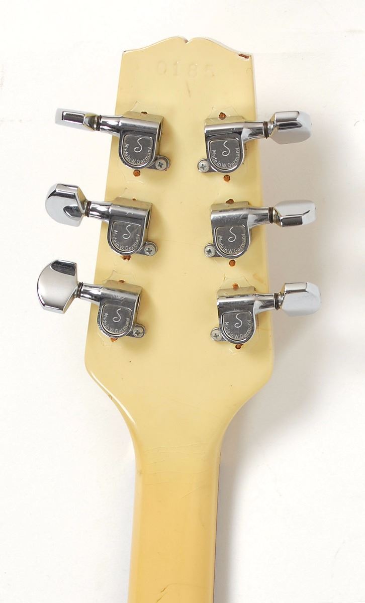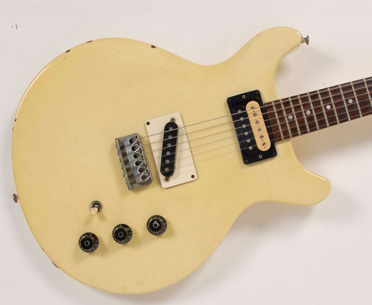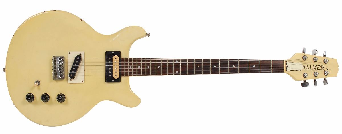 Johnny Ramone’s personally-owned and stage-used vintage white Hamer right-handed custom electric guitar, embossed with its serial number on the reverse of the headstock, “0185,” and signed and inscribed on the back in black felt tip, “To Adam, Johnny Ramone.” Featuring deep body contours and a larger, more flared headstock than found on stock Hamer special models, this ‘special’ lightweight Hamer guitar was designed to fit the specific needs of Ramone. The guitar’s original bridge humbucking pickup was removed and a single coil pickup installed on a cream-colored mounting plate. Additionally, the original Kluson tuning machines were later replaced with Schallers; the old tuner impressions remain visible on reverse of headstock. The presence of the “0185” serial number suggests that this model was subcontracted by an ex-partner of Hamer, as no matching four-digit code exists in the factory logs alongside the other Ramone-specific Hamers. Includes its original modified Hamer hardshell case, with the neck pocket housing an off-white Ramones guitar pick and an assemblage of guitar strings, with several by Darco Funky, Ramone’s string of choice. In fine condition, with expected yellowing to body finish. Oversized. All of the modifications to the Hamer were made by Johnny Ramone’s team per his specific request.