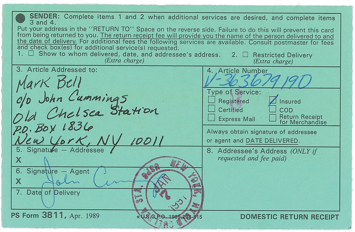 Post office receipt for a certified letter, stamped New York, January 7, 1991, signed in blue ballpoint with his legal name, “John Cummings.” In fine condition, with the stamp affecting the end of the signature.