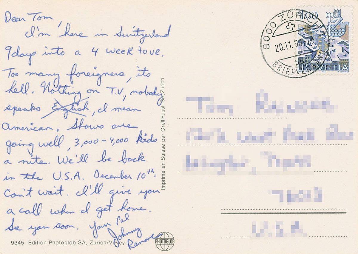 ALS, one page on a 6 x 4 postcard, postmarked Zurich, November 20, 1990. Letter to a friend. In part: “I’m here in Switzerland 9 days into a 4 week tour. Too many foreigners, its [sic] hell. Nothing on T.V., nobody speaks English [crossed out], I mean American. Shows are going well, 3,000–4,000 kids a nite. We’ll be back in the U.S.A. December 10th. Can’t wait.” In fine condition.