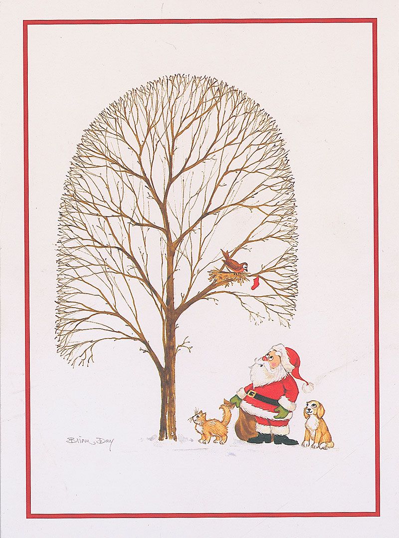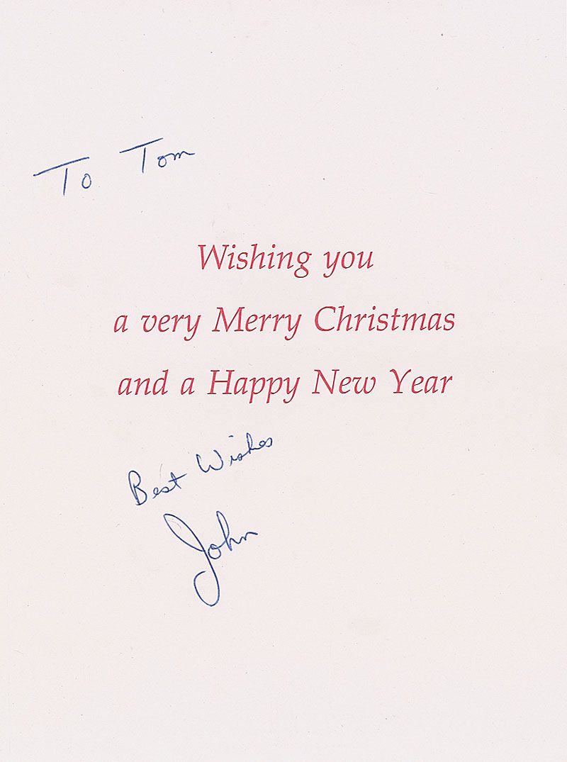 Christmas card, measuring 5.5 x 7.5 closed, bearing an image of Santa with some animals on the front and a printed sentiment inside, signed and inscribed inside in blue ballpoint, “To Tom, Best Wishes, John.” A couple light diagonal creases, otherwise fine condition. Accompanied by the original mailing envelope, filled out in Ramone’s hand, including his legal name in the return address area, “John Cummings.”