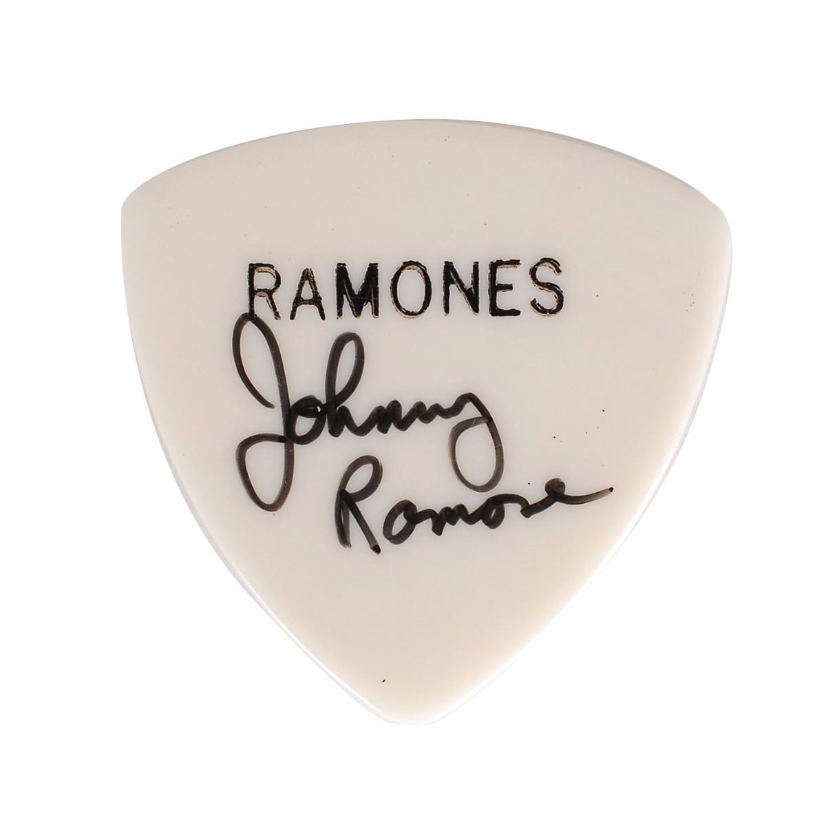 Off-white Ramones guitar pick, 1.25 x 1.25, neatly signed on the front side in black ink. In fine condition. A desirable, uncommon format signed by one of punk’s most influential pickers. From the Punk Rock Collection of Adam Greiss.