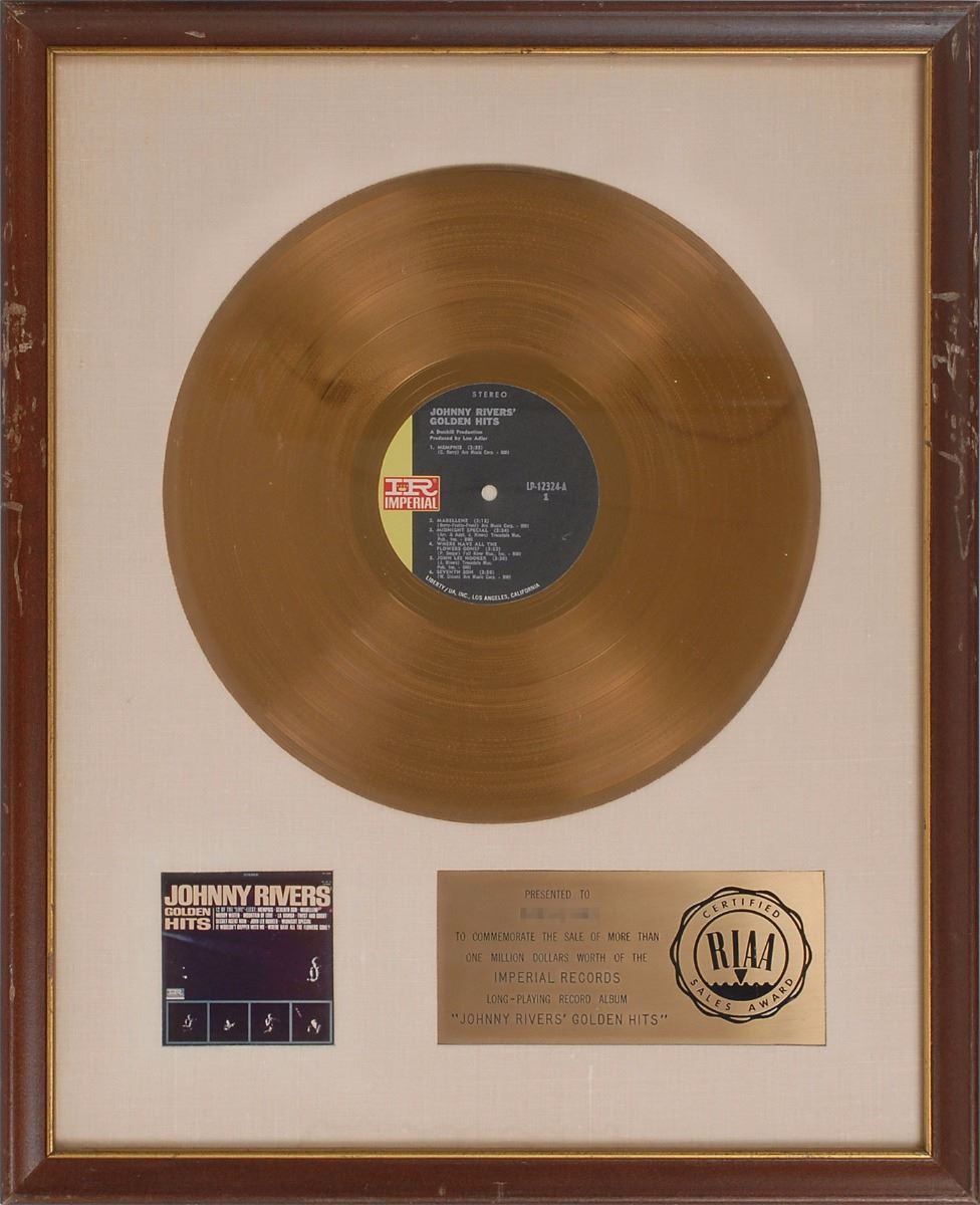 Official white-matte RIAA gold sales award presented “to commemorate the sale of more than one million dollars worth of Imperial Records long-playing record album ‘Johnny Rivers’ Golden Hits.’” Framed with its disc, plate, and a small image of the album cover to an overall size of 17.5 x 21.75. Award retains its original backing with a New York Frame & Picture label. In fine condition, with some scuffing to the frame.