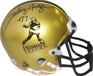 As a player with the University of Nebraska Cornhuskers, Johnny Rodgers served as a punt return specialist, pass receiver, and running back. Rodgers broke virtually every offensive team record, was twice named to the College Football All-America Team and won the Walter Camp Award and the Heisman Trophy in 1972 for most outstanding player in college football in the United States. Johnny Rodgers has hand autographed this Gold Heisman Riddell Authentic mini helmet with 72 Inscription. Certificate of Authenticity from Athlon Sports.