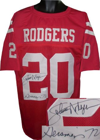 As a player with the University of Nebraska Cornhuskers, Johnny Rodgers served as a punt return specialist, pass receiver, and running back. Rodgers broke virtually every offensive team record, was twice named to the College Football All-America Team and won the Walter Camp Award and the Heisman Trophy in 1972 for most outstanding player in college football in the United States. Johnny Rodgers Nebraska Cornhuskers has hand signed this unlicensed TB custom-prostyle red jersey with twill stitched nameplate and numbers with Heisman '72 inscription. JSA Hologram and Certificate of Authenticity.
