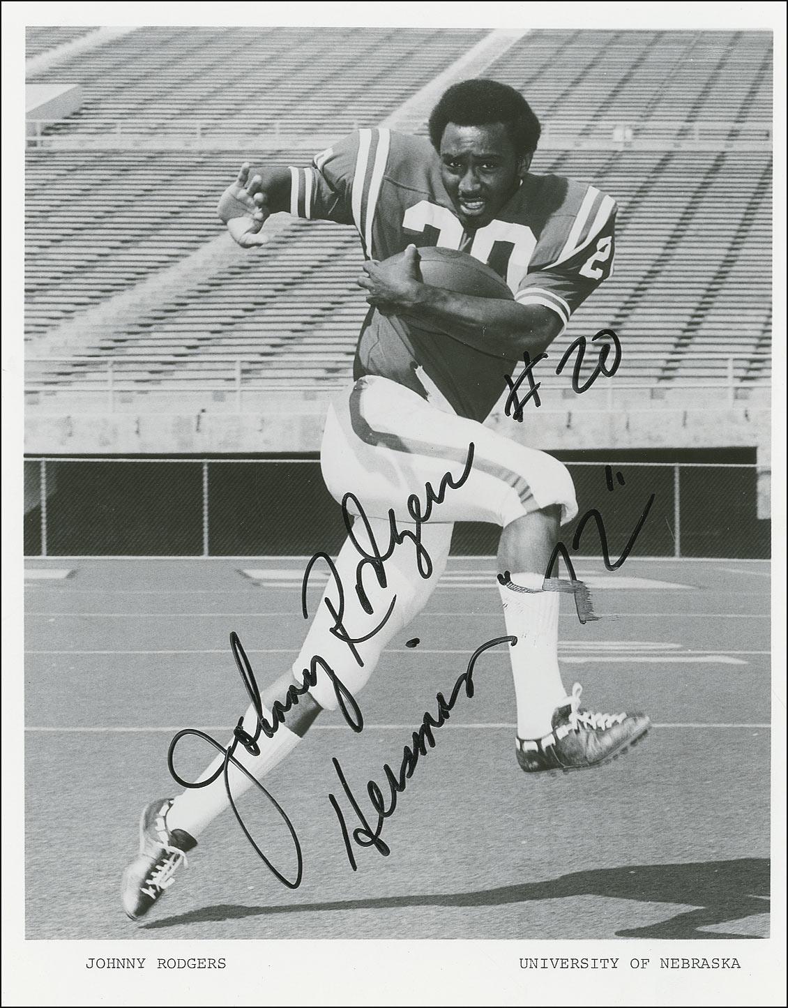 College Football Hall of Famer and the winner of the 1972 Heisman Trophy. Glossy 8 x 10 photo of Rodgers at the University of Nebraska, signed in black felt tip “Johnny Rodgers #20 Heisman ‘72.’” In fine condition.