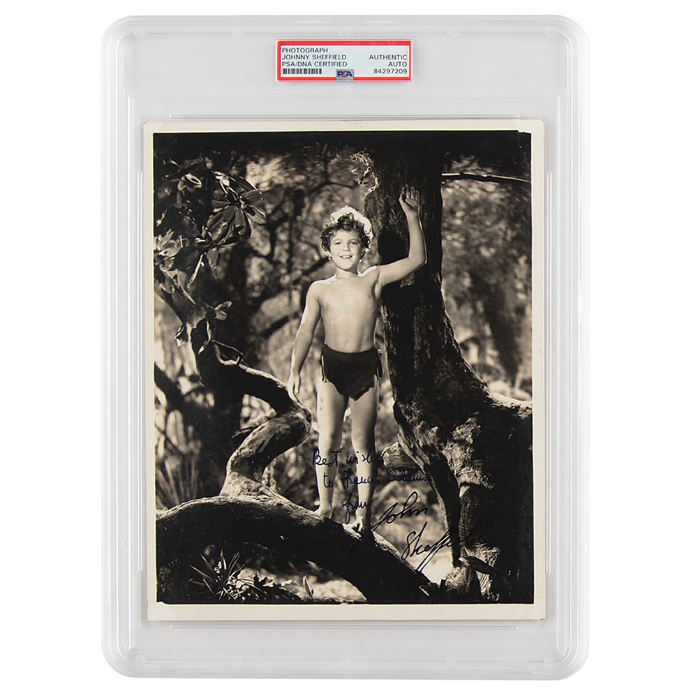 Vintage matte-finish 8 x 10 photo of the child actor as 'Boy' in the Tarzan film series, signed and inscribed in fountain pen, "Best wishes to Franklin Adams, from John Sheffield.†In fine condition, with surface loss at the corner tips. Encapsulated in a PSA/DNA authentication holder.
