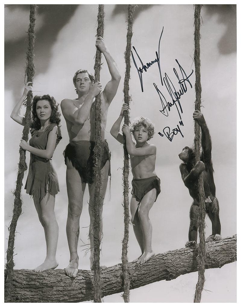 Glossy 14 x 11 photo of Tarzan, Jane, Boy, and Cheetah holding vines in a tree, signed in black felt tip, “Johnny Sheffield, ‘Boy.’” In very fine condition.