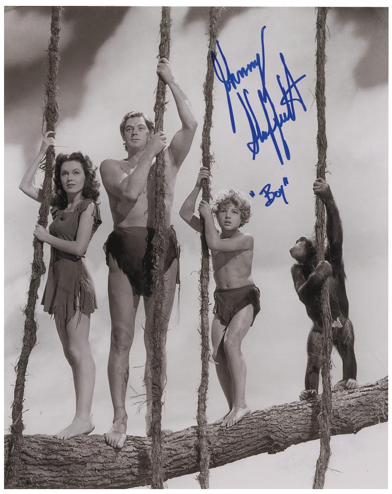 Glossy 8 x 10 photo of Jane, Tarzan, Boy, and Cheetah holding vines in a tree, signed in blue felt tip, “Johnny Sheffield, ‘Boy.’” In very fine condition.