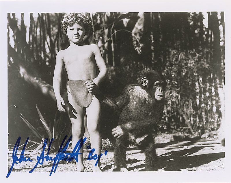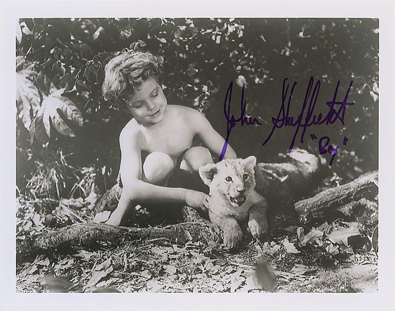 Two glossy 10 x 8 photos of Sheffield with jungle animals from the Tarzan films, each signed in blue felt tip, “Johnny Sheffield, ‘Boy.’” In overall fine condition.