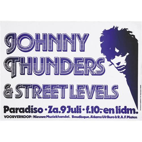 <B>Johnny Thunders Paradiso Concert Poster (1981)</B></I> Guitarist Johnny Thunders practically invented the punk rock guitar hero. His initial splash of fame came with the early 1970s glam rockin' New York Dolls, who have been cited as the direct inspiration for the Sex Pistols. Next came the Heartbreakers (not to be confused with Tom Petty's backing band), who were without a doubt <I>the</B></I> poster boys for "heroin chic". Before his addiction got the best of him, Johnny toured the world, including this early '80s appearance at the Paradiso, a converted church club in Amsterdam. The poster measures 24" x 17", and is printed in an unusual "split fountain" blue and black on white. VG++. Don't be "so alone" when you can have Johnny hanging around!