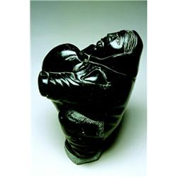 The large black stone carving depicting an Inuit man and seal in battle. Height 12.5.