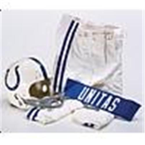 Johnny Unitas was one of the greatest quarterbacks to ever play the game. During his 18 year NFL career, Unitas led the Colts to three NFL championships, including one Super Bowl, and was inducted into the Pro Football Hall of Fame in 1979. At the time of his retirement, he held records for the most pass attempts, most completions, most total yards, most touchdowns, most 300-yard games, and most consecutive games throwing touchdown passes. This "Rawlings" manufactured helmet has been re-conditioned with the inner webbing being removed. Inside is player number "19" written twice in black marker. On the back of the helmet is player number "19" in blue stickers. On the right rear of the helmet is "Air-Flo HND-9 7-1/8-7-1/4". Inside the inner waistband of the pants is the "RUSSELL SOUTHERN" manufacturers tag with wash instructions and size "34." Player number "19" is written in black marker. Both the helmet and pants show game-use and except for the helmet being re-conditioned with the webbing removed appears to have no alterations of any kind. Also included is a blue nameplate from a 1970-71 blue nylon durene jersey. It measures 16-3/4" x 3-1/2" and has player name "UNITAS" done in white tackle twill. These items were originally sourced from an ex-Colts employee.