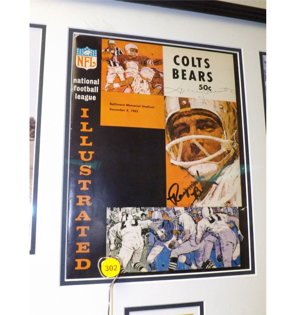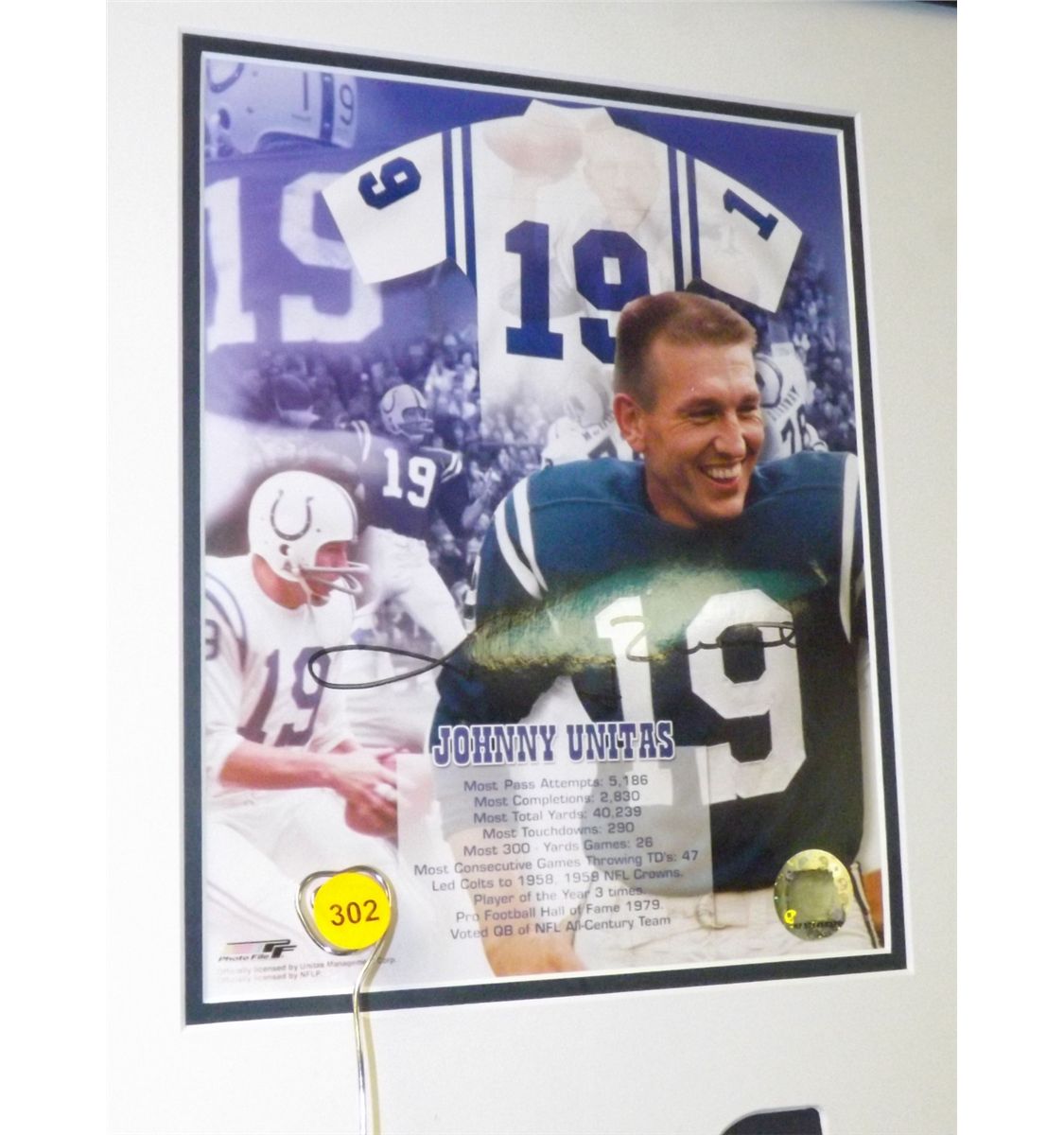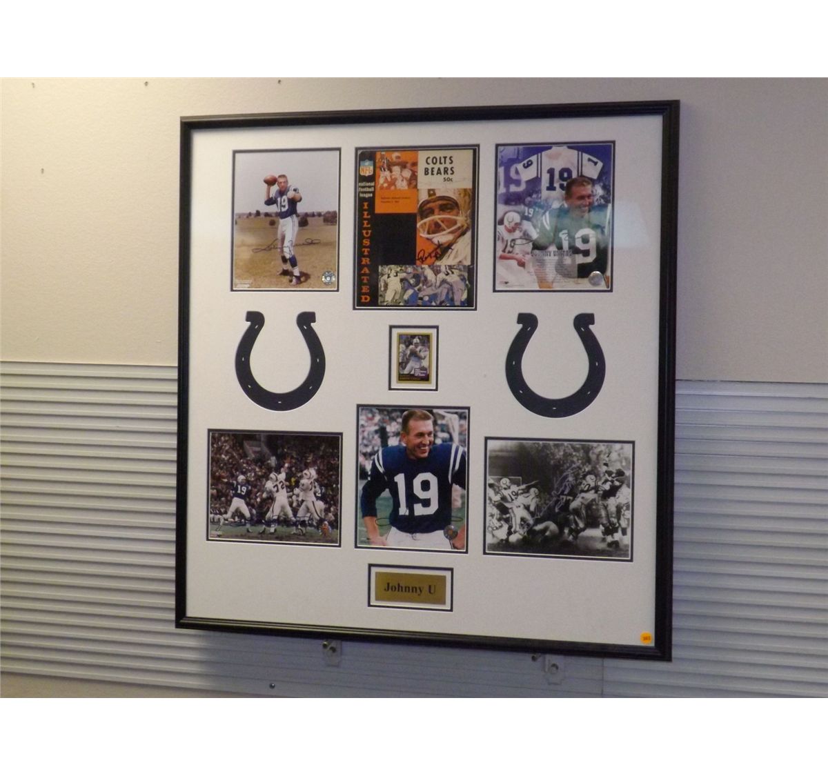 Johnny Unitas Matted and Framed Display. 5 Photos Autographed by Johnny Unitas and One 'NFL Illustrated "Colts Bears Baltimore Memorial Stadium Dec. 5th 1965"' Program Autographed by Johnny Unitas and Raymond Berry. Appraised or estimated retail value $7000. COAs by Signature Dreams and My Favorite Players. All Sales Final. Please see terms and conditions of auction.