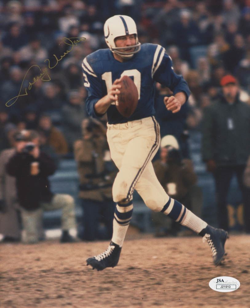 Photo measures 8" x 10" in size and has been hand signed in gold paint pen by Johnny Unitas (D. 2002, HOF).
