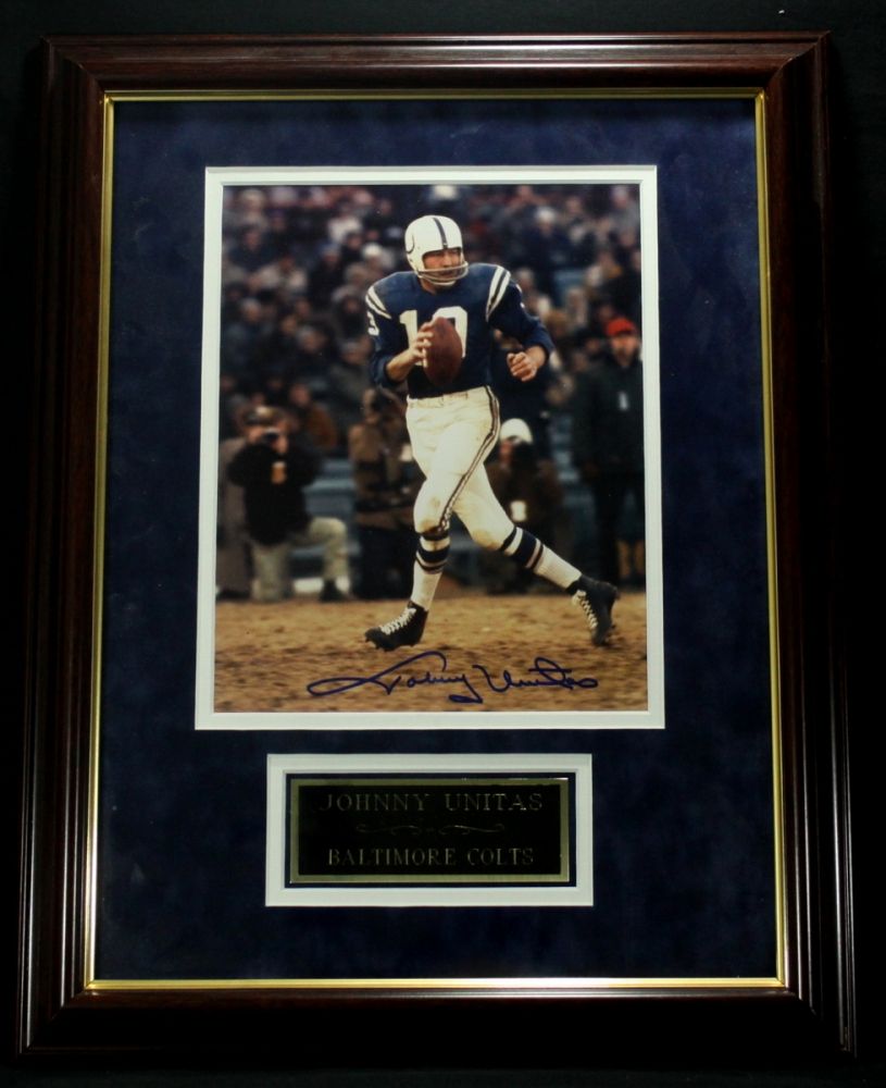 Hand-signed in blue felt-tip pen by Johnny Unitas (Colts HOF D 2002). Custom framed to 15x19" in size. Autograph includes a Global Authentics (GA) hologram and matching COA for authenticity purposes.