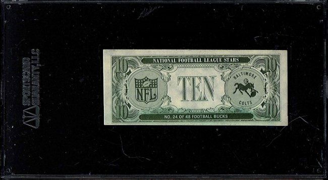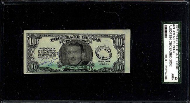 SGC authenticated and encapsulated Johnny Unitas signed 10 dollar football buck. This is hand signed by Unitas in blue ink. The football buck mentions Unitas breaking the touchdown record with 32 in a season, and that he was in his 7th year with the Colts.