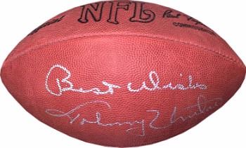 Johnny Unitas who played from the 1950s through the 1970s. He spent the majority of his career playing for the Baltimore Colts. He was a record-setting quarterback, and the National Football League's most valuable player in 1959, 1964 and 1967. For 52 years he held the record for most consecutive games with a touchdown pass (which he set between 1956–1960), until New Orleans Saints quarterback Drew Brees broke his long standing record on October 7, 2012. Unitas was the prototype of the modern era marquee quarterback with a strong passing game, media fanfare, and widespread popularity. He has been consistently listed as one of the greatest NFL players of all time.Johnny Unitas has hand signed this Official NFL Tagliabue Football with Best Wishes inscription. Certificate of Authenticity from Athlon Sports Collectibles.
