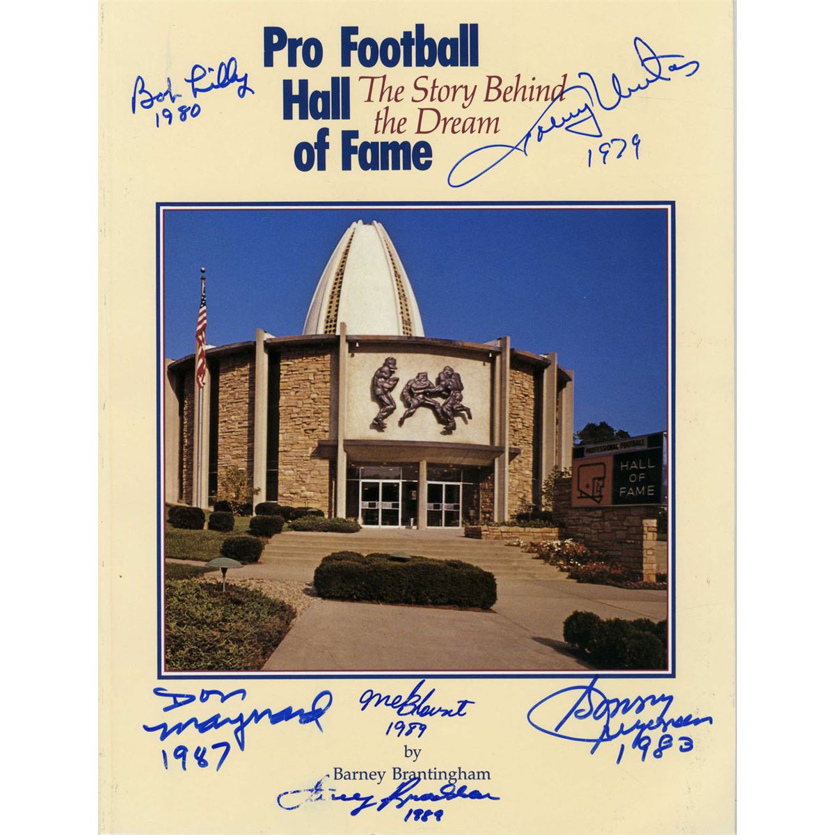 ''Pro Football Hall of Fame'' book signed by HOF's Bob Lilly, Johnny Unitas, Don Maynard, Mel Blount, Terry Bradshaw and Sonny Jurgensen, all of whom added the year they were inducted into the exclusive fraternity of players. Published by Sequoia Communications Inc. for the Pro Football Hall of Fame: 1989. Signatures in blue marker are all bold and clear, except for light smudging to ''Bob'' in Lilly's signature and ''Terry'' in Bradshaw's signature. Book is in near fine condition. Overall a stunning display.