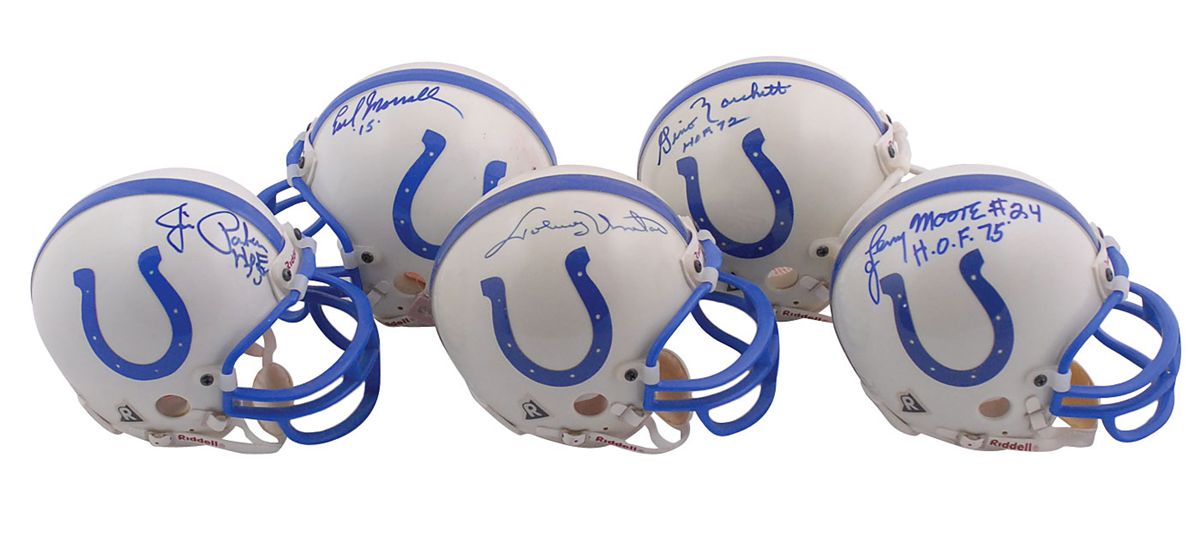 Five official Riddell replica Baltimore Colts mini helmets, each signed on the top in felt tip by a legendary Colts player, including: Johnny Unitas, Gino Marchetti, Larry Moore, Earl Morrall, and Jim Parker. In overall fine condition.