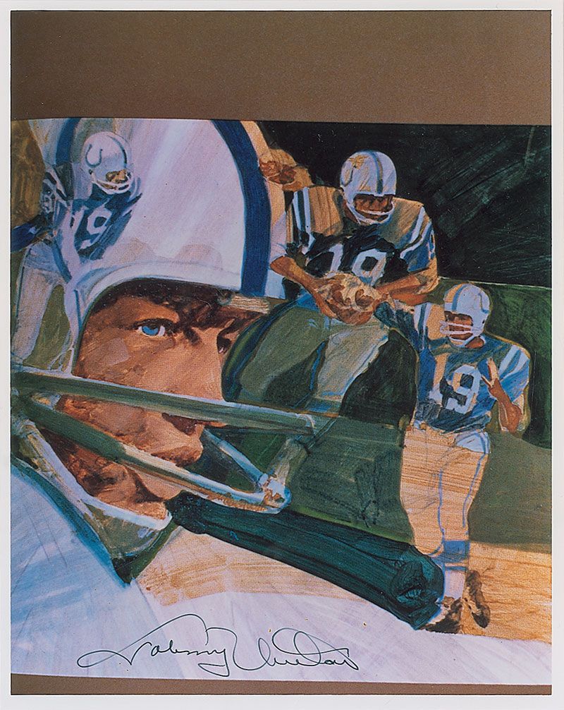 Neat color glossy 8 x 10 photo of an artist’s composite work of Unitas, signed in black felt tip. In very fine condition.