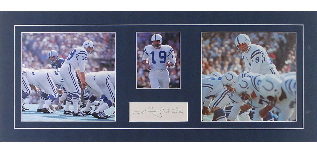 Ballpoint signature, “Johnny Unitas,” on an off-white 4 x 1.25 card. Matted with three photos of Unitas to an overall size of 22 x 9.25. In fine condition.