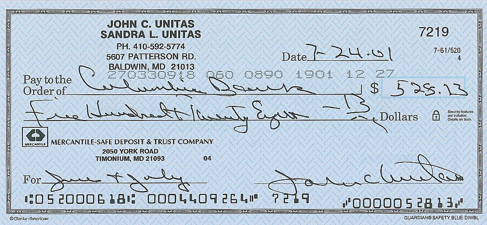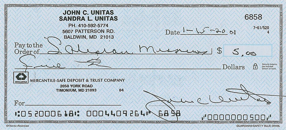 Two personal checks, both 6 x 2.75, both dated 2001, and both filled out and signed by Unitas, “John C. Unitas.” In fine condition.