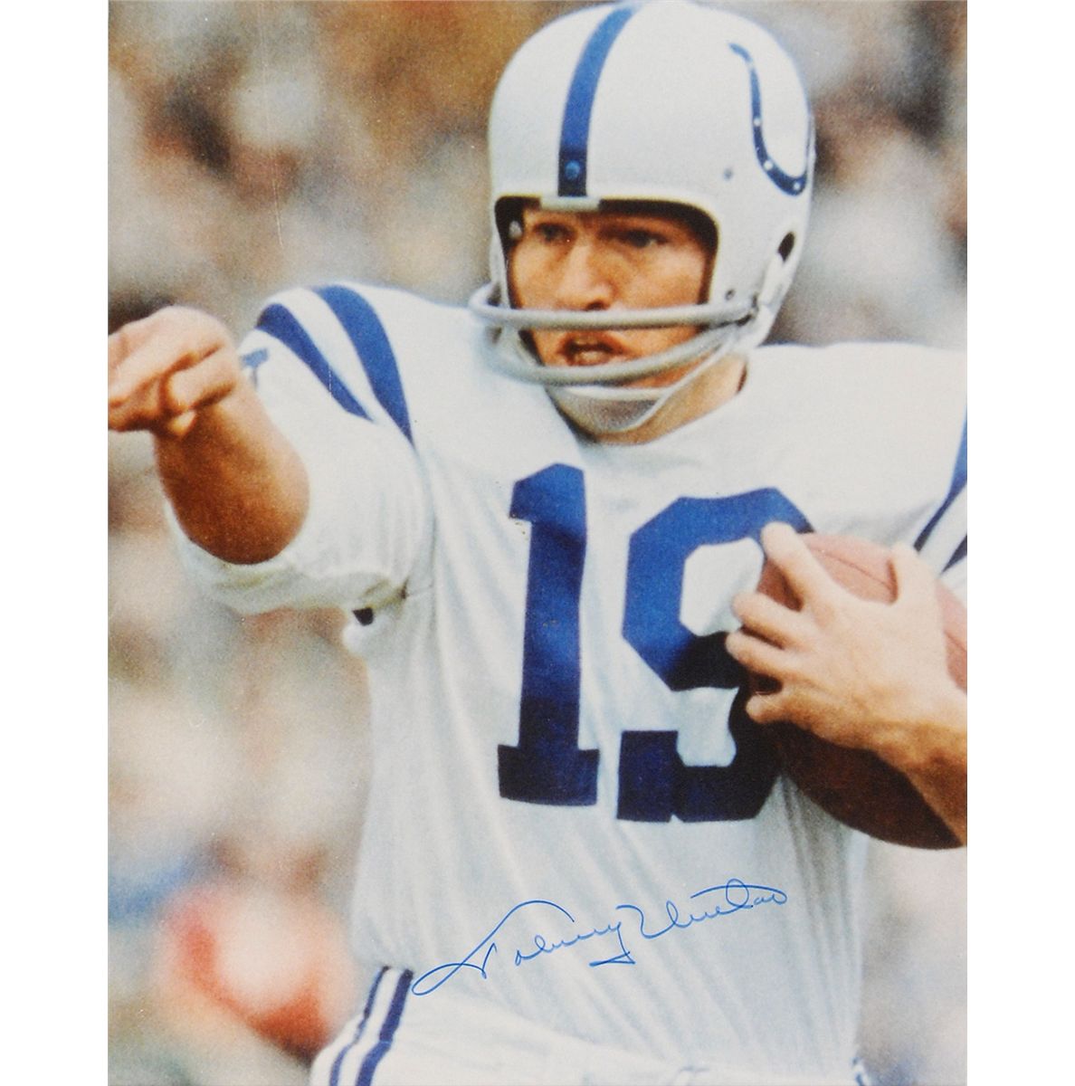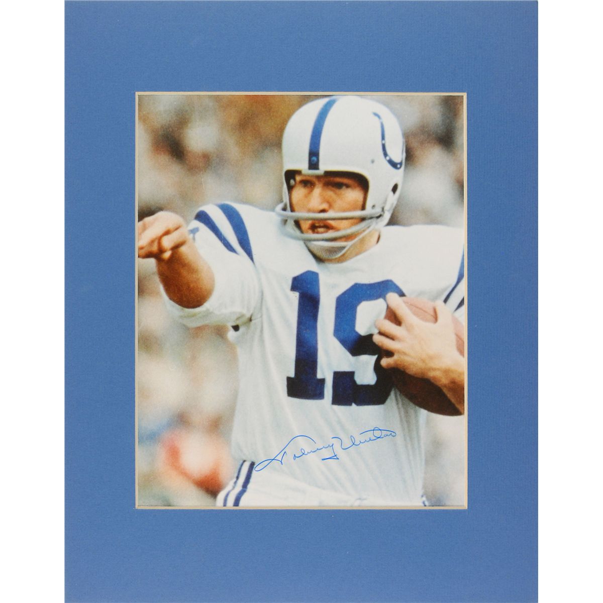 Color glossy 7.5 x 9.5 photo of Unitas carrying the football, signed in blue felt tip. Matted to an overall size of 11 x 14. In fine condition.