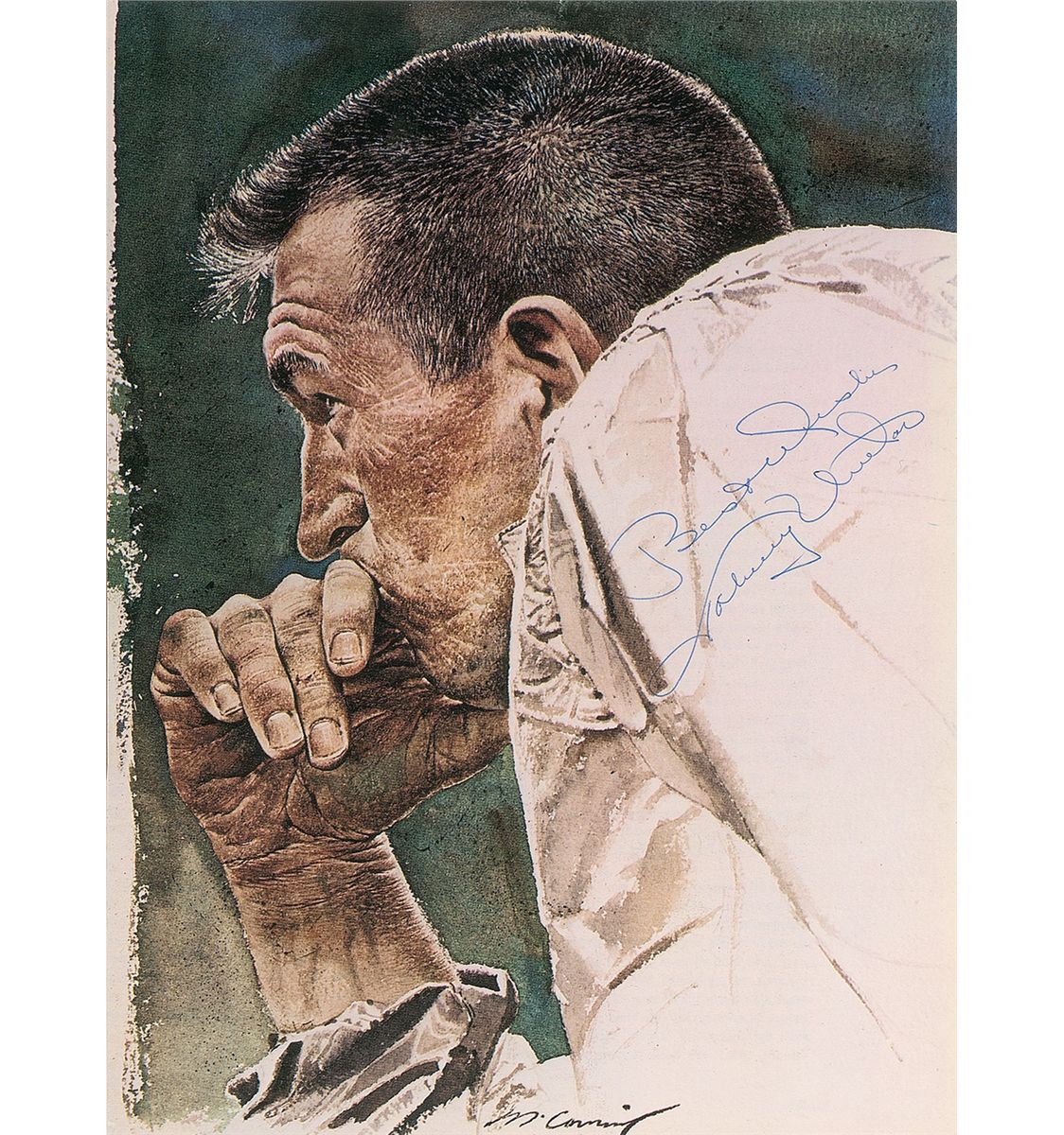 Color 8 x 10 magazine photo of an artist’s portrait of the quarterback, signed in blue ballpoint, “Best wishes, Johnny Unitas.” In fine condition.