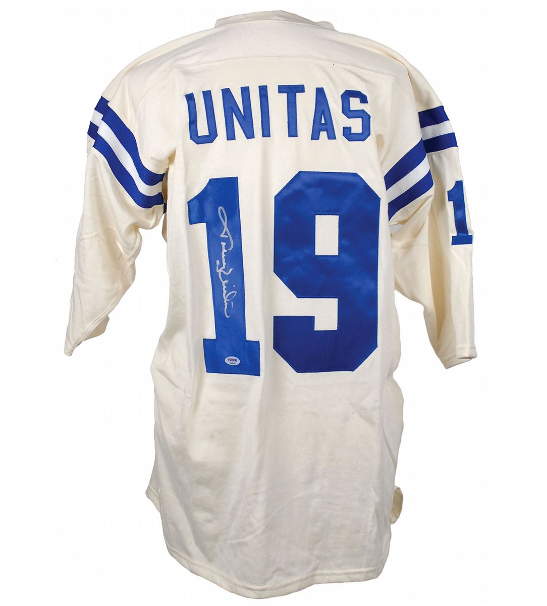 Replica Baltimore Colts football jersey, with sewn on letters and numbers, signed in silver ink on the number on the back. In fine condition, with a PSA/DNA label affixed to the number. Accompanied by a certificate of authenticity from PSA/DNA.
