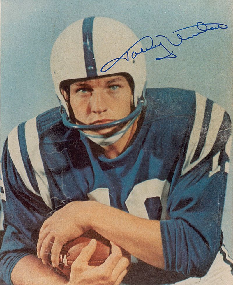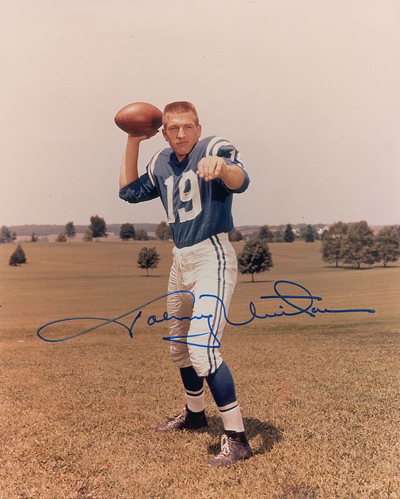 Two color satin-finish 8 x 10 photos of Unitas in his Baltimore Colts uniform, each attractively signed in blue felt tip. In overall fine condition.