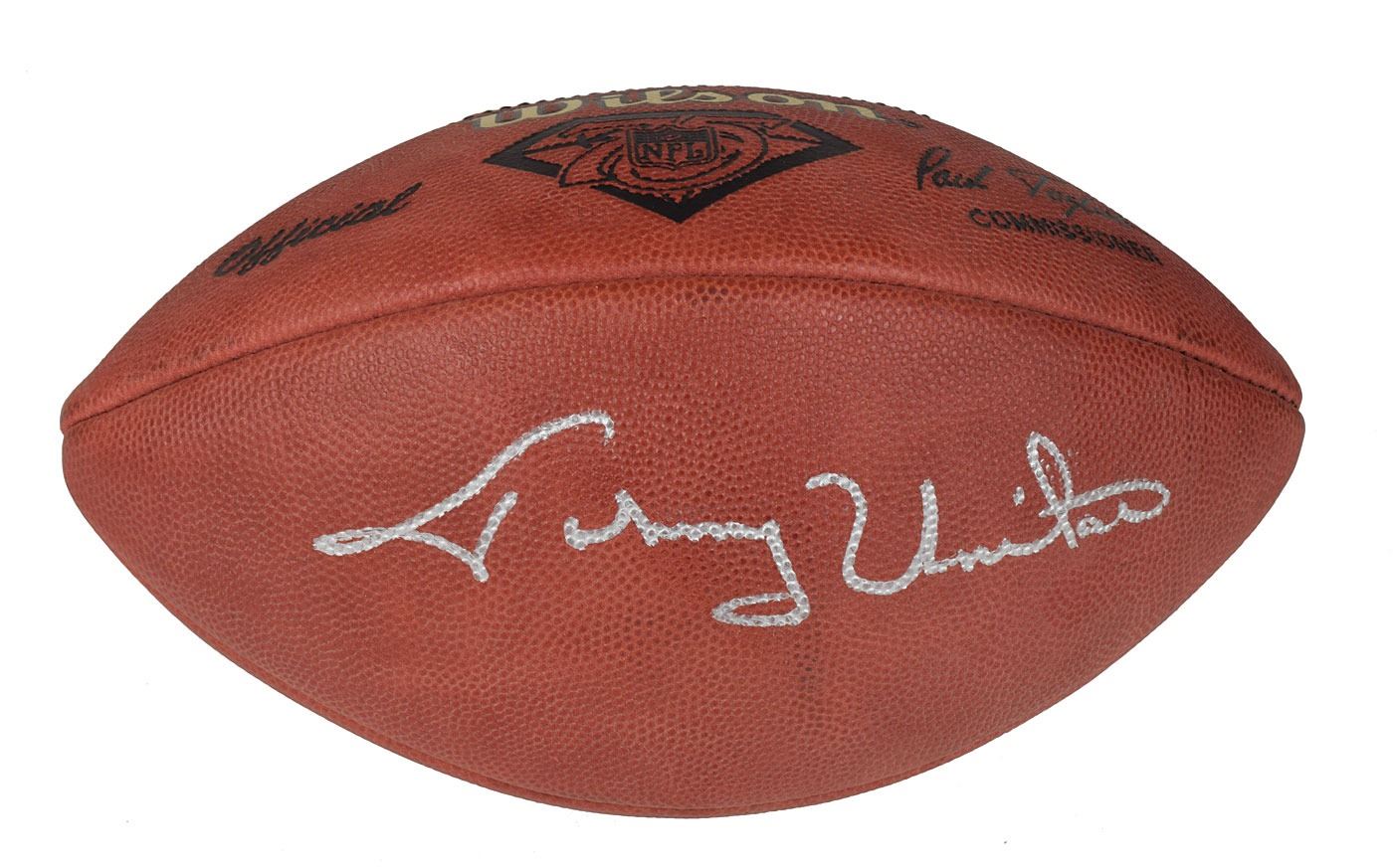 Official Wilson NFL football signed on a side panel in silver ink by Unitas. Includes the original box. In fine condition.