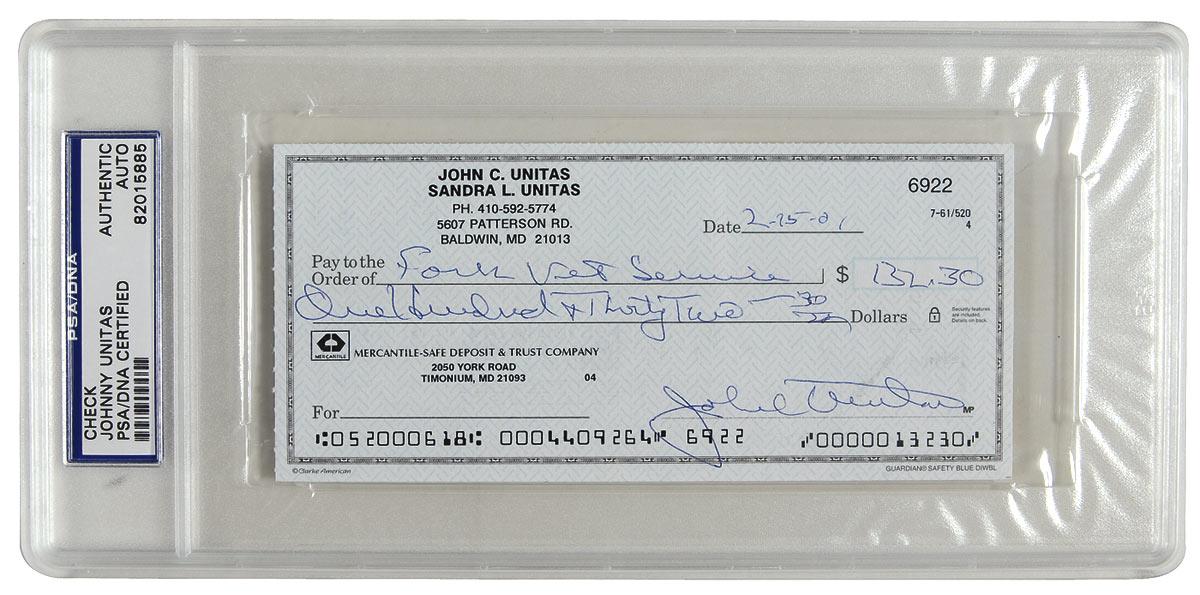 Personal check, 6 x 2.75, filled out and signed by Unitas, payable to Foak Vet Services for $132.50, February 25, 2001. Encapsulated in a plastic PSA/DNA authentication holder. In fine condition. RRAuction COA.