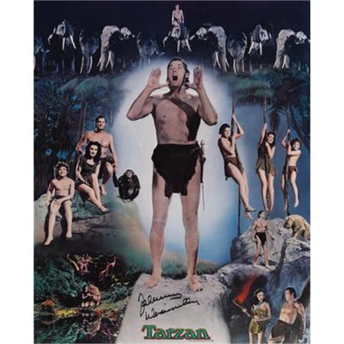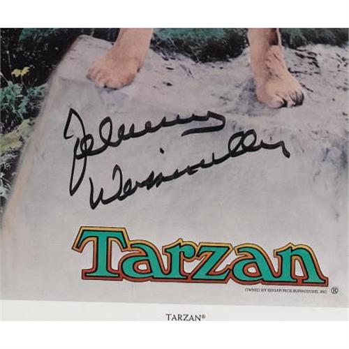 <B>Johnny Weissmuller Autographed Lithographic Poster (Nostalgia Merchant, 1977).</B></I> Olympic swimmer and movie star Johnny Weissmuller made history when he became the first person to swim 100 meters in less than one minute, but he's mostly remembered as the star of the 12 Tarzan movies made by MGM between 1932 and 1948. Featured here is a Near Mint condition color montage poster of characters from the Tarzan movies, number 642 of a limited edition of 1,500, signed in black felt pen by Weismuller. In Excellent condition, framed to an overall size of 26" x 31.5". <I>Accompanied by a COA from Nostalgia Merchant.</B></I> <I>Accompanied by LOA from PSA/DNA.</B></I><BR><BR><b>Shipping:</b> Framed - with Glass, Large (<a target="_blank" href="http://www.heritageauctions.com/common/shipping.php">view shipping information</a>)