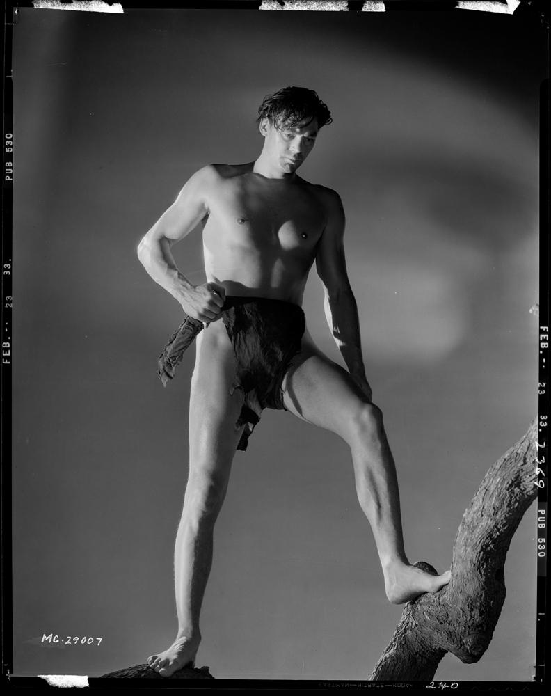 (M-G-M, 1933) Black-and-white 8 x 10 in. camera negative on nitrate film of Johnny Weissmuller by Tarzan and His Mate; with EASTMAN-NITRATE-KODAK etched and FEB 23 33 PUB 530 on the border, and MG-29007 in India ink. Very fine; with mounting paper remnant at the upper border.