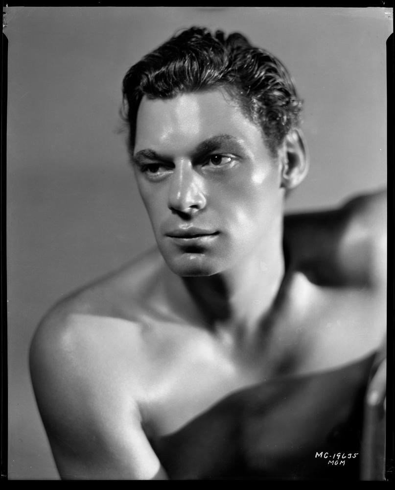 (M-G-M, 1932) Black-and-white 8 x 10 in. camera negative on nitrate film of Johnny Weissmuller by Tarzan, the Ape Man; with MG-19635 MGM in India ink and extensive retouching. The celebrated Portfolio II sitting. Fine; with handling and visible retouch at the lower center.