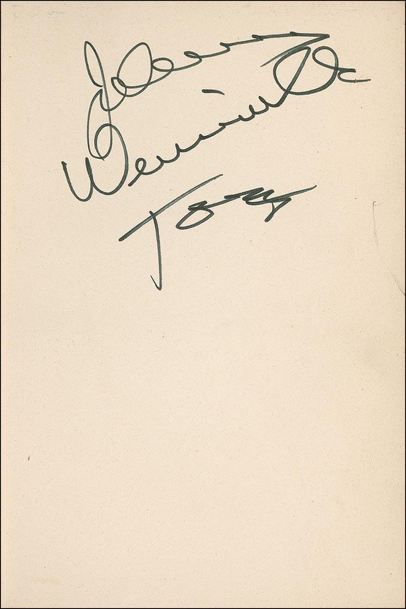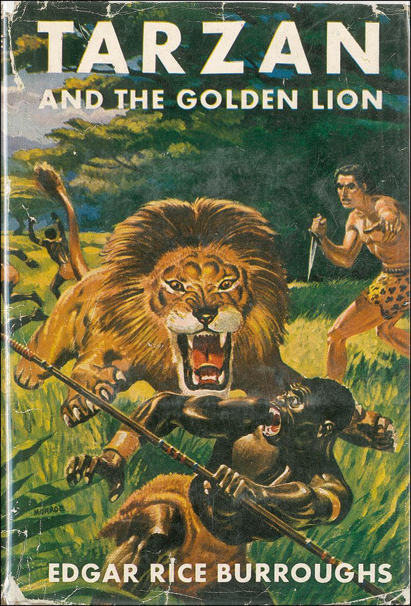 Signed book: Tarzan and the Golden Lion. First edition, first printing. NY: Grosset and Dunlap, 1923. Hardcover with dustjacket, 5.25 x 7.75, 332 pages. Signed in black felt tip on the first free end page, “Johnny Weissmuller, Tarzan.” A couple stray ink marks and pencil remnants to signed page, some light cover wear, and some scattered creases, soiling, and paper loss to dustjacket, otherwise fine condition.