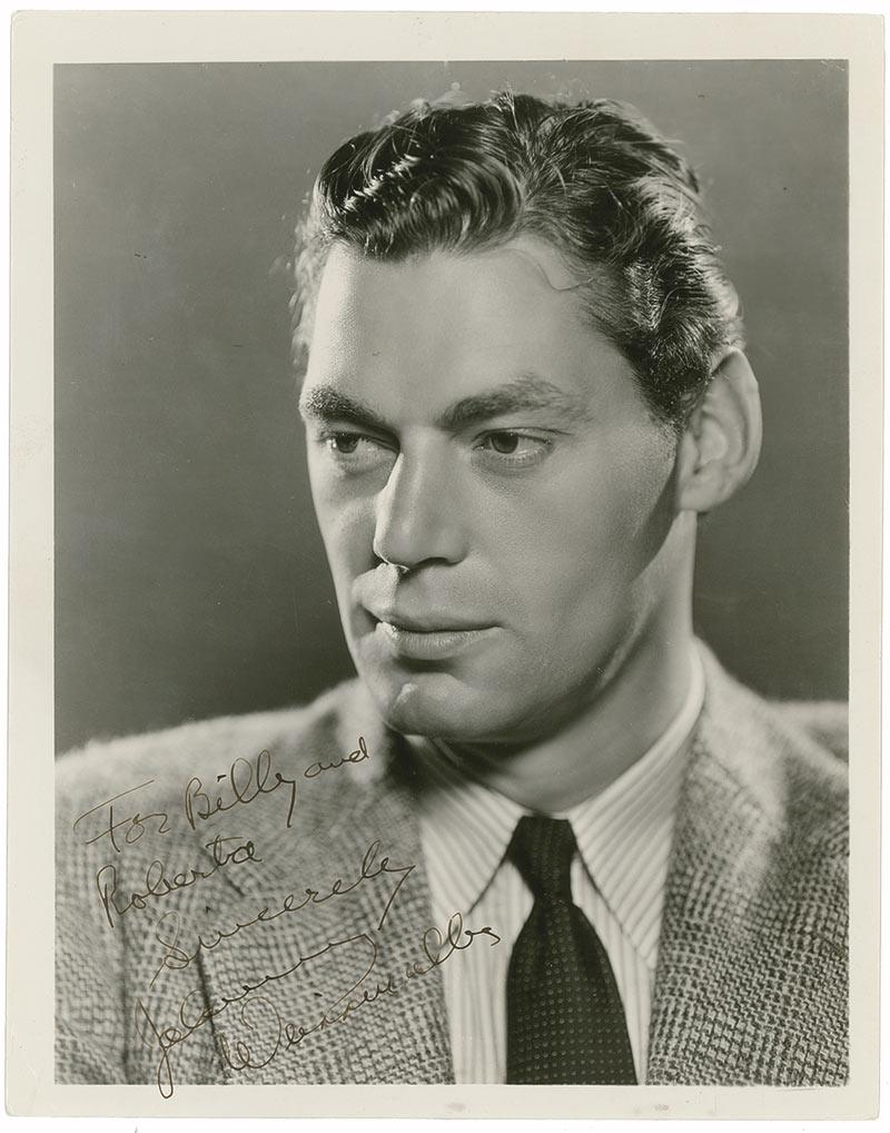 Vintage glossy 8 x 10 photo of a distinguished Weissmuller in a suit jacket and tie, signed and inscribed in black fountain pen “For Billy and Roberta, Sincerely, Johnny Weissmuller.” In fine condition, with light scattered surface marks and surface creases to corners.