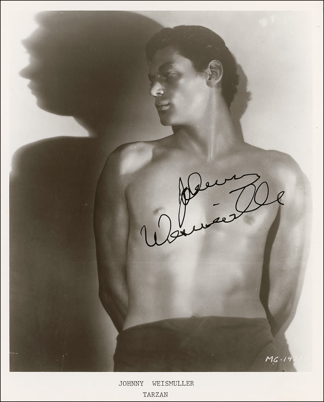 Glossy 8 x 10 photo of the shirtless star, boldly signed in black ink “Johnny Weissmuller.” In fine condition, with tiny corner bends.