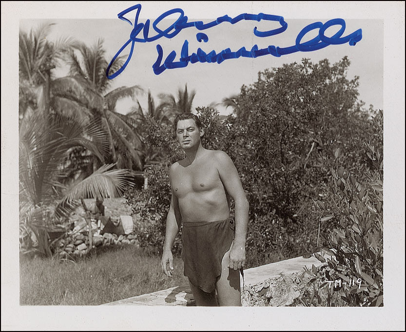 Two glossy 4 x 5 photos of a bare-chested Weissmuller, each signed in blue felt tip. In overall fine condition.