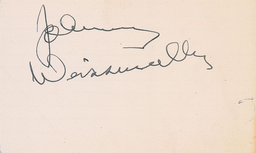 Vintage ink signature, “Johnny Weissmueller,” on an off-white 5 x 3 card. In fine condition, with a bit of light toning to edges.