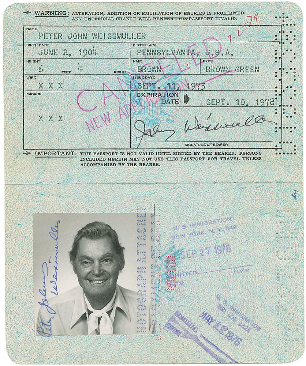 Weissmuller’s personal passport, number D1923284, issued on September 11, 1973. Passport measures 3.75 x 6, and contains his typed personal information on the second page, signed at the bottom, “Johnny Weissmuller.” Affixed opposite the personal information page is Weissmuller’s 2.5 x 2.5 passport snapshot, signed vertically in the left border, “Peter Johnny Weissmuller.” Balance of the pages bear visa stamps from around the world, dated between 1975 and 1976, including those from Portugal, Turkey, Argentina, and the United Kingdom. In fine condition. Originates from the estate of Weissmuller’s stepdaughter, Lisa Weissmuller Gallagher. Accompanied by two personal checks payable to the passport office made out by his wife, Maria Weissmuller. A one-of-a-kind collectible from the life of the talented actor and sportsman.